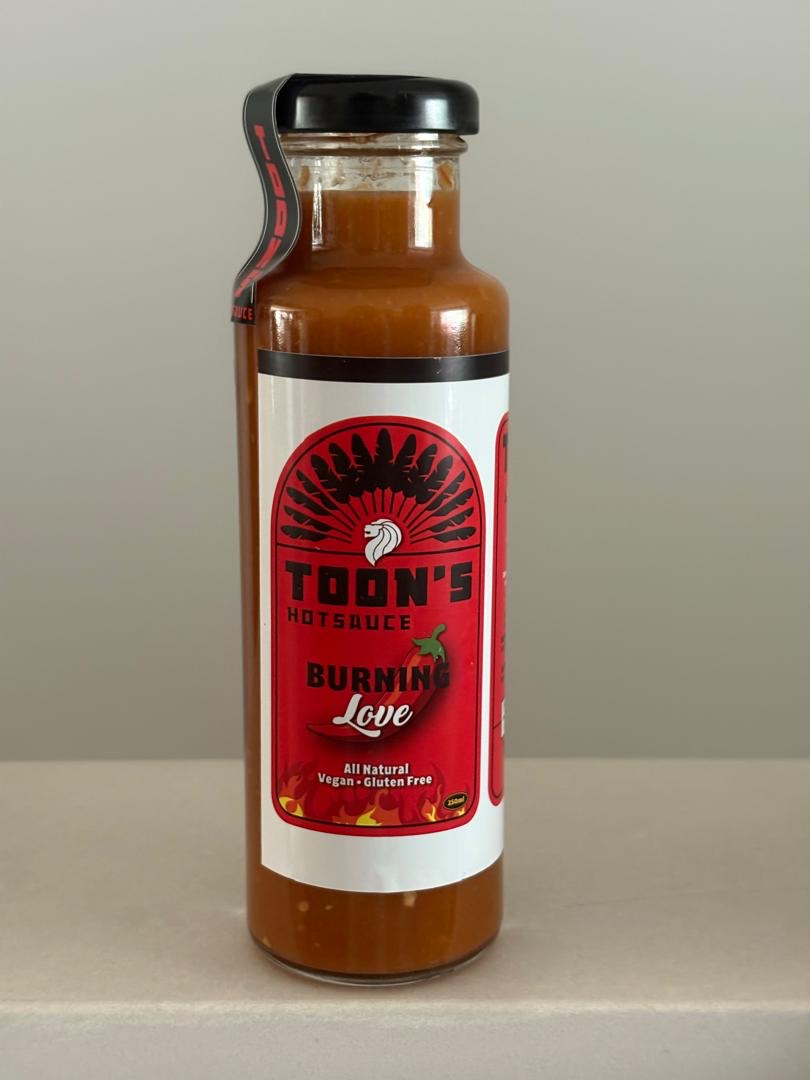 Toon’s Burning Love, is delicious, flavourful and is our spiciest hotsauce.